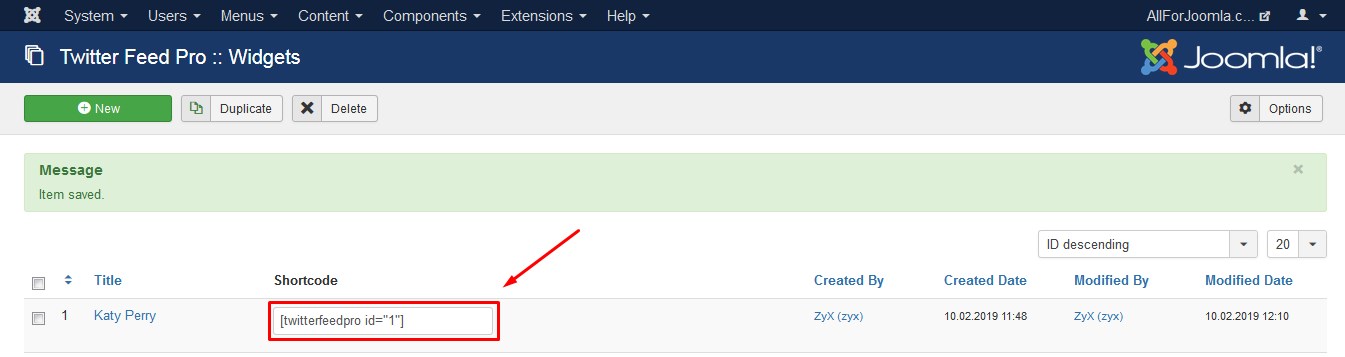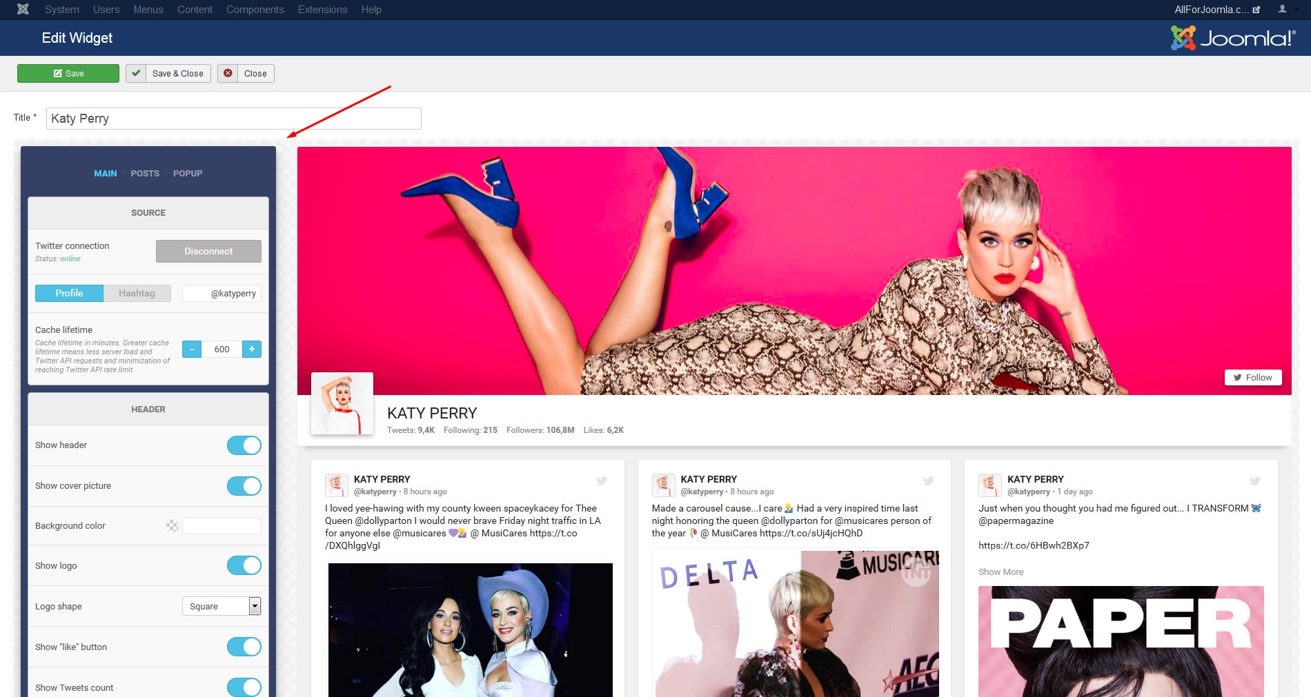 Widget creation and widget management is performed in admin section Components > Twitter Feed Pro.
