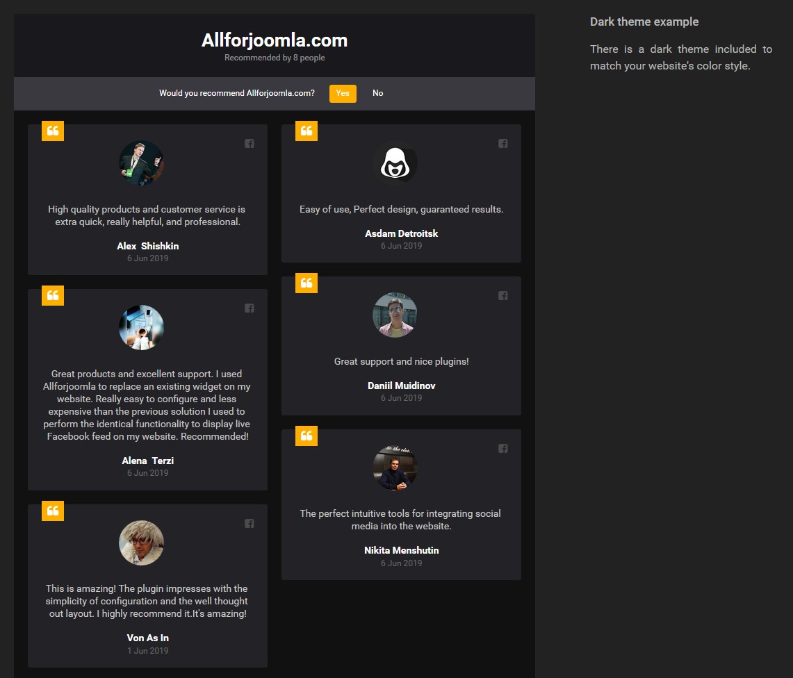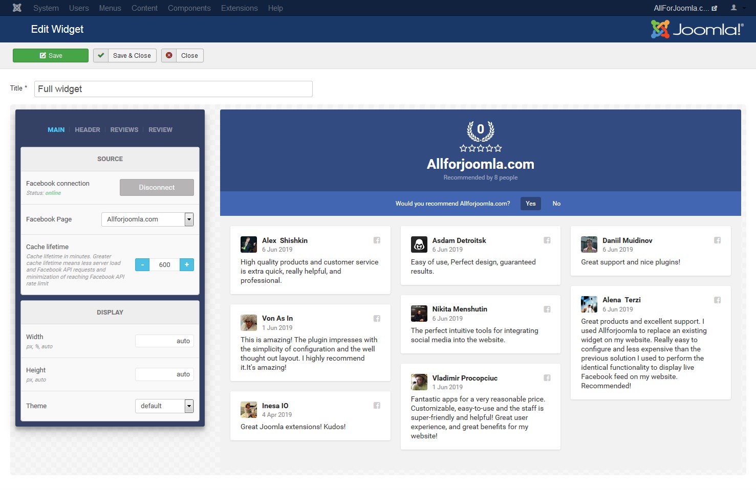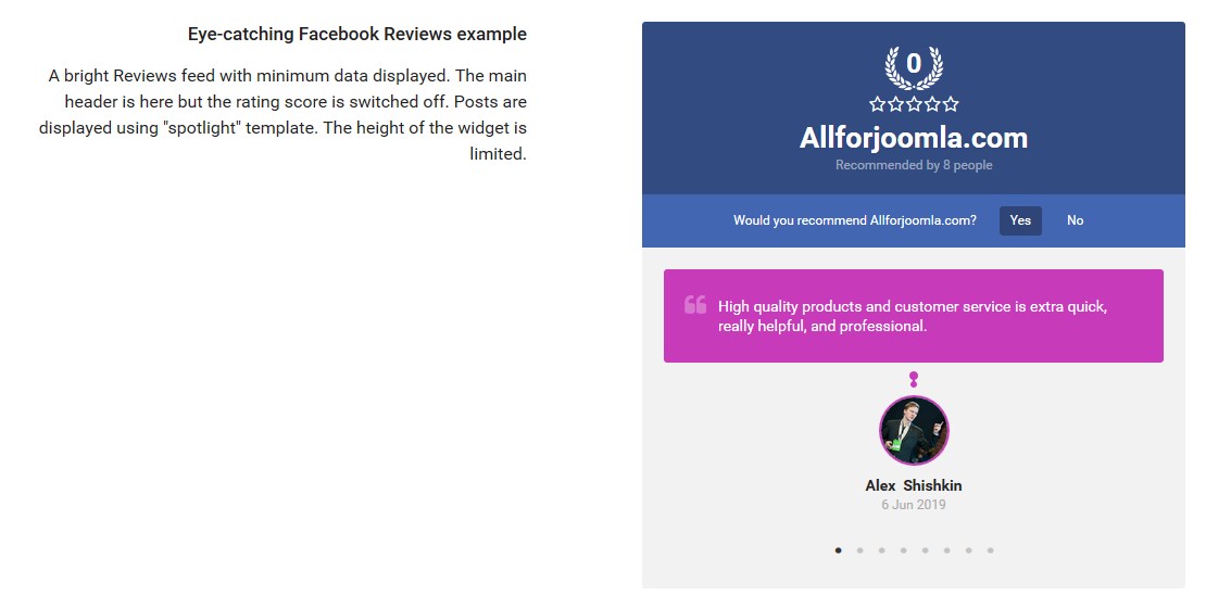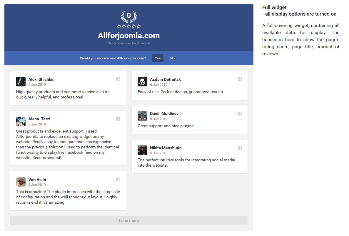 Facebook Page Reviews is a simple and powerfull tool to add Facebook Reviews to Joomla website in an easy and seamless way. With this extension you can increase your website visitors trust by showing real people’s reviews. Use your high rating and excellent reviews to prove your items are worth buying and attract new sales.