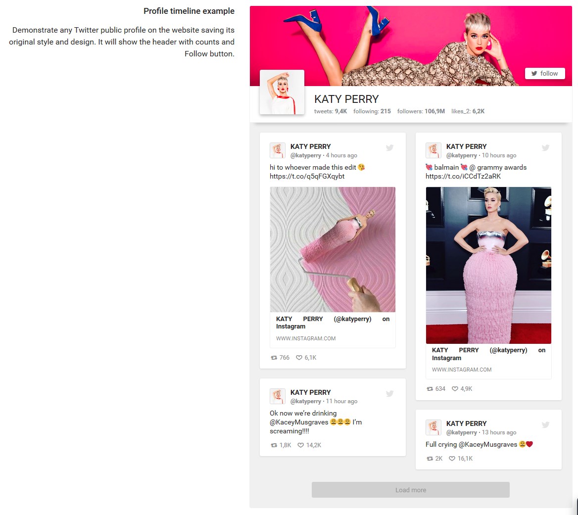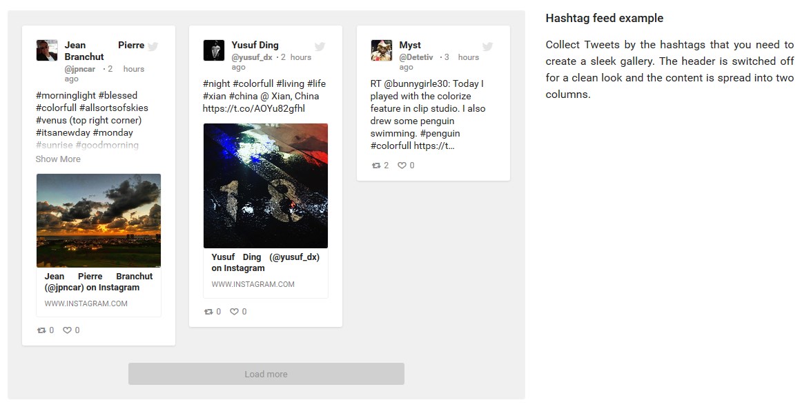 This extension is able to work in 2 different modes: displaying any public Twitter profile with tweets or displaying tweets by hashtag. You can create feeds with photos and and videos which will be updated automatically when there will be new tweets.