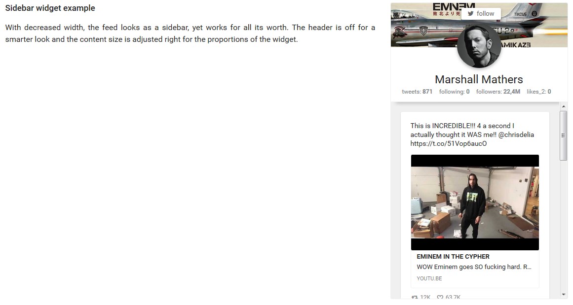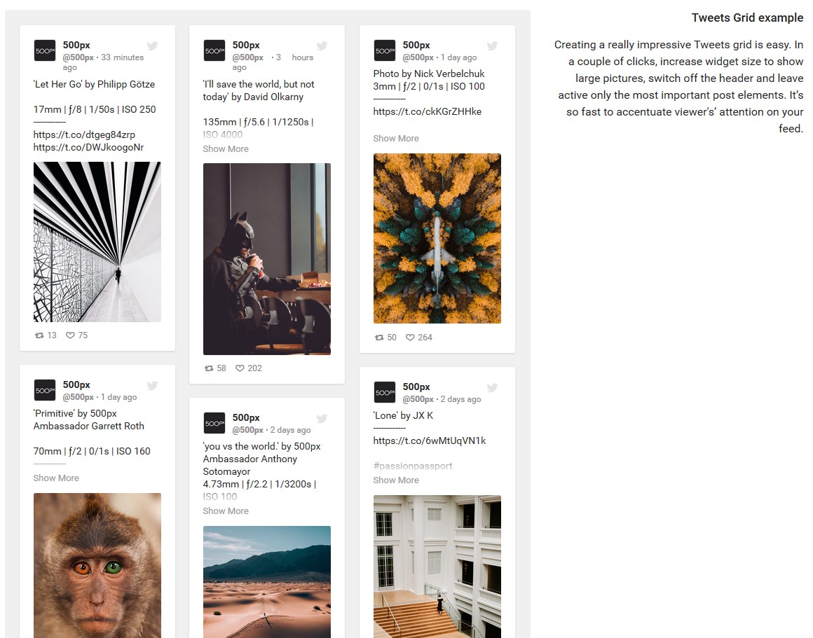 Customize the feed to fit your website's layout with more than 30 customizable options. Show widget as a complete source of your Twitter profile information or turn it into an attractive feed/gallery.