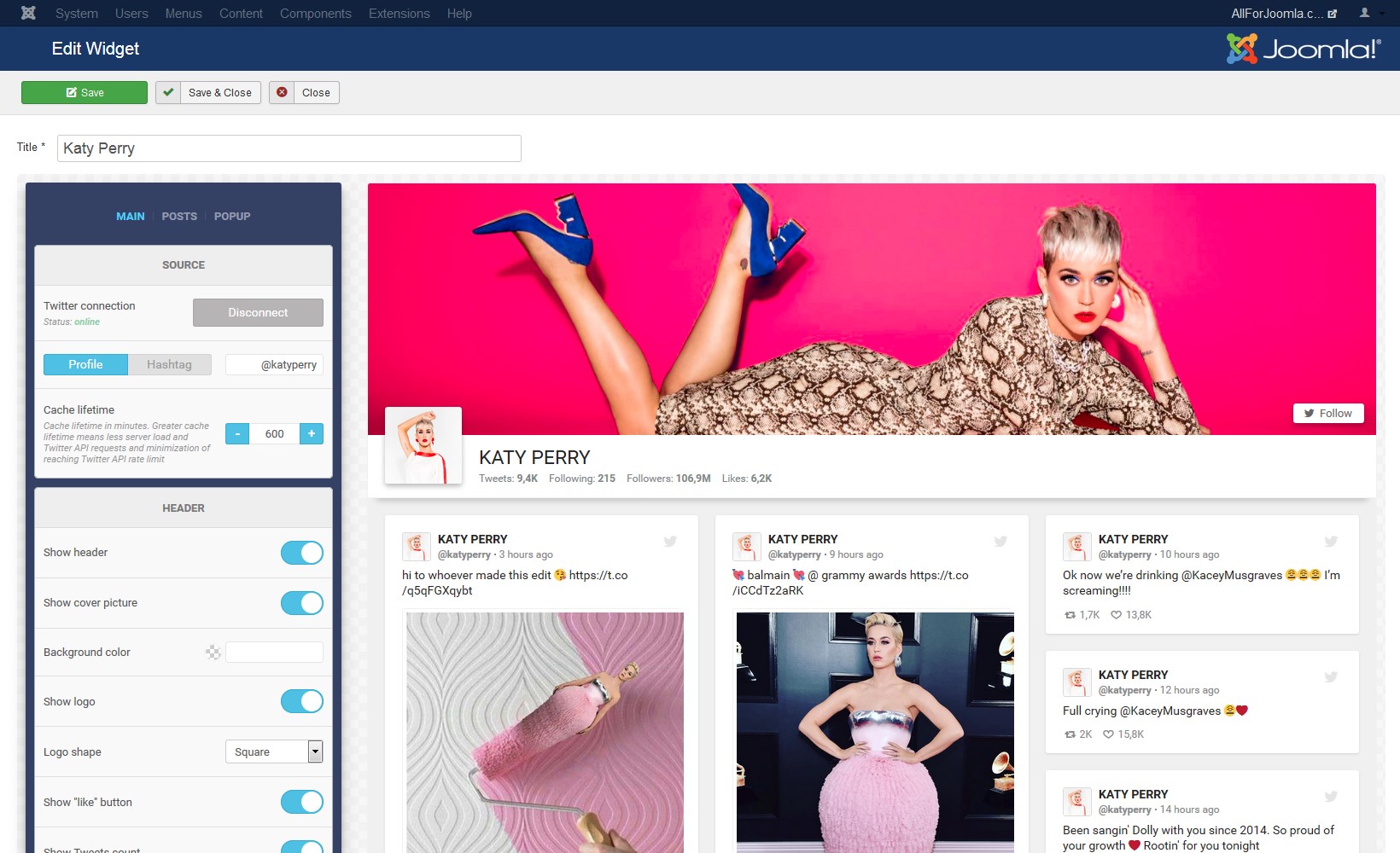 Twitter Feed Pro is a simple and powerfull tool to add Twitter (now it is x.com) content to Joomla website in an easy and seamless way. With this extension you can increase you audience and engagement of your website visitors. Tweets that you publish on your Twitter account or tweets with certain hashtags will be automatically displayed on your website with the Twitter Feed Pro extension.